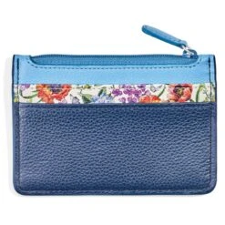 A pretty pop of our Blossom Hill floral artwork accents this sleek card coin case in soothing and stylish blue fine leather.