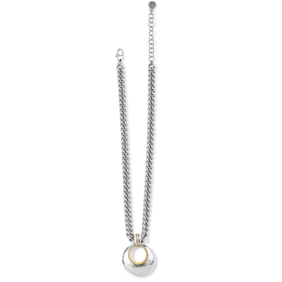 This pendant necklace with softly hammered details and golden accents is modern art-to-wear – breathtaking from every perspective.