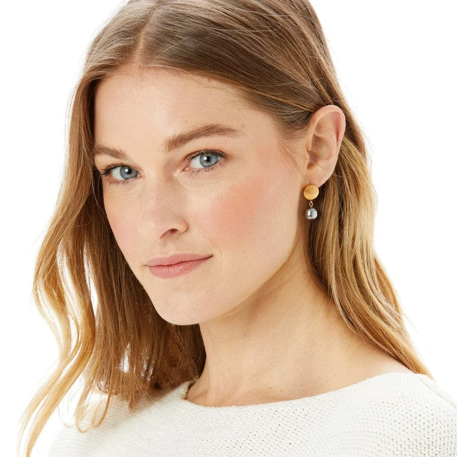 Handmade gray baroque pearls dangle from hammered golden disks. These earrings are simple yet elegant, a finishing touch to your look.