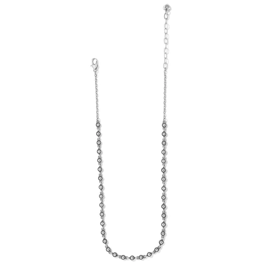 A string of silver beading/studs are linked together to create this super-cool necklace that can be worn short solo as a collar or layered with two other necklaces.