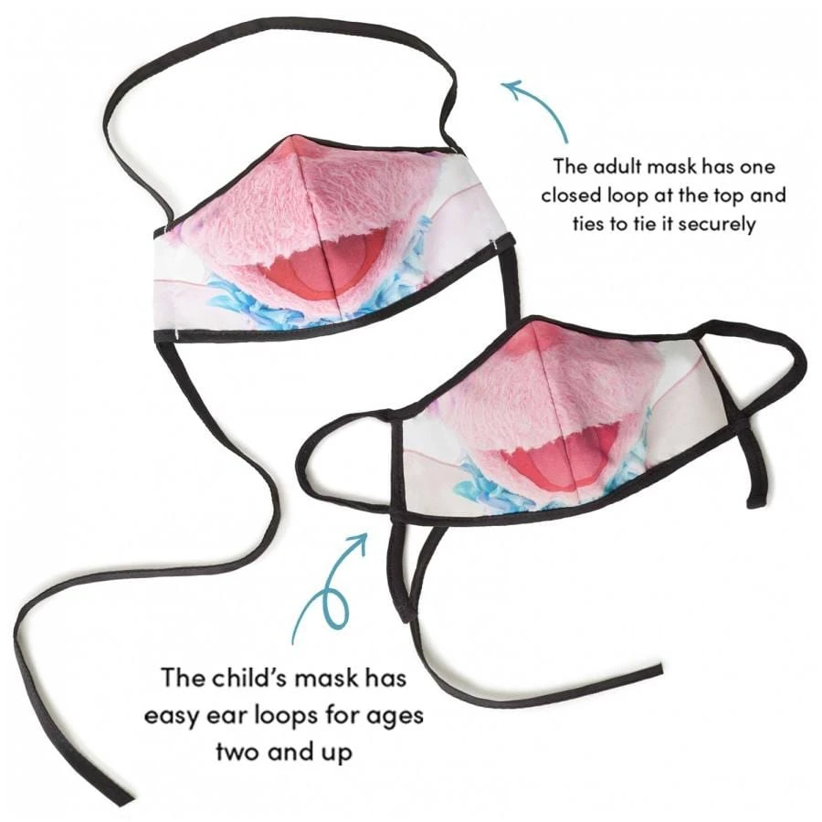 The Abby Cadabby face mask set is part of our collection in partnership with our friends at Citizens of Humanity and Sesame Workshop which supports families facing the challenges of COVID-19. Our nonmedical, reusable mask set is part of an effort to help combat the spread of COVID-19. The adult mask has a tie design, and the child’s mask has ear loops and fits children age 2 and up. Wash before first use, and after each wear. NONRETURNABLE. Please read the disclaimer here before purchasing.