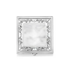 This silvery etched pill box with opalescent insert is breathtakingly beautiful. Features an interior mirror and pressure release opening for ease and convenience!